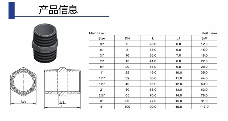 | 不鏽鋼六角外(wai)絲接頭 | |